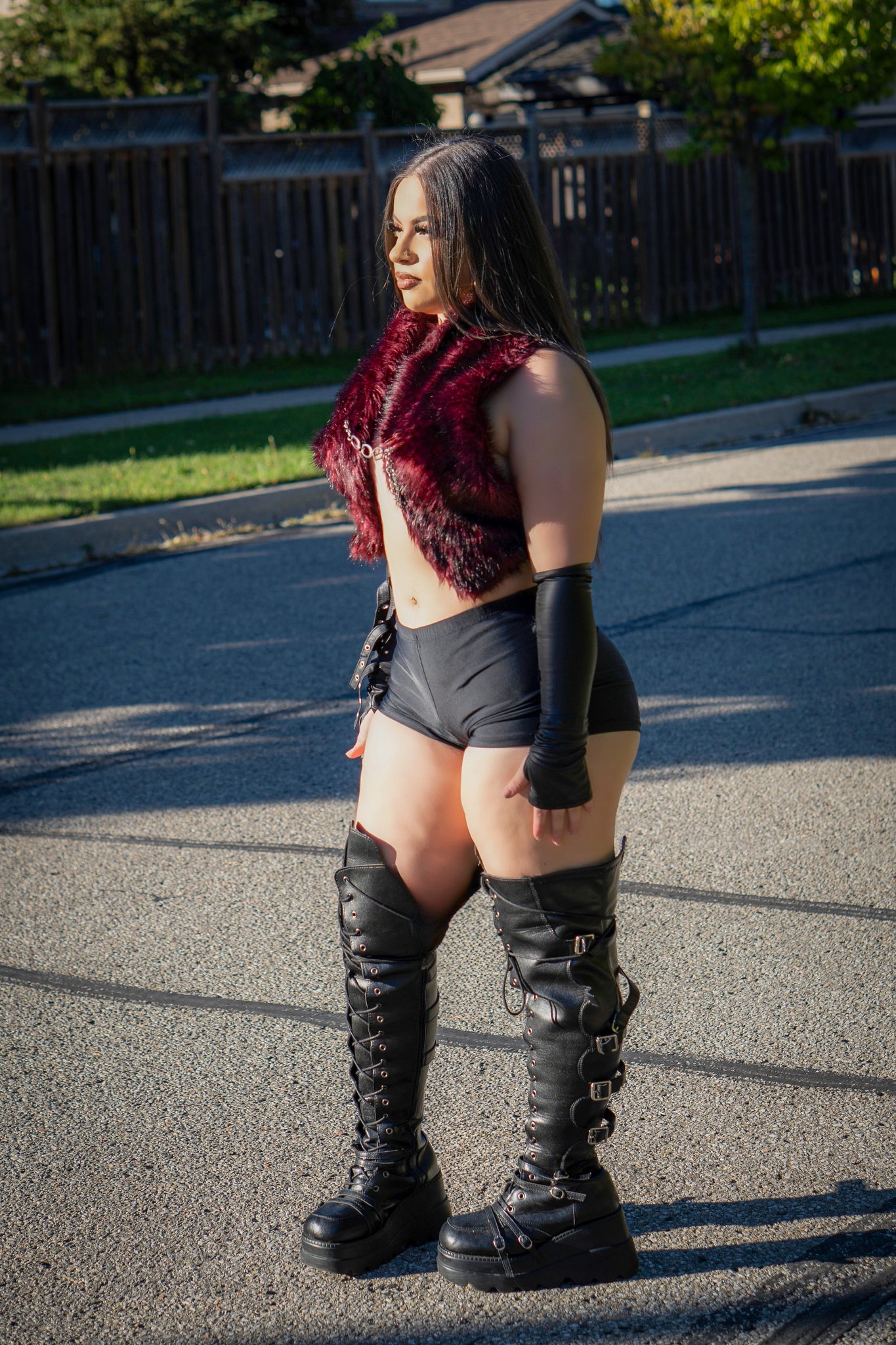 The Velvet Heat look is all about effortless temptation — a faux fur wrap top with glimmering metal chains, sleek black spandex shorts, and glossy gloves that catch every bit of light. Designed for the woman who doesn’t need to say much to own the room.